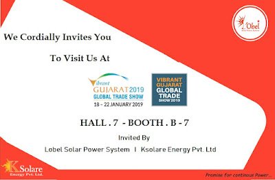 We are cordially invites you to witness our revolutionary startup of OnGrid 4th generation Inverter (Made in INDIA) & Lobel Solar EPC Project & customized Service Partner @ Hall No. 7, Booth No. 7, Vibrant Gujarat 2019, Gandhinagar, Gujarat, INDIA.
