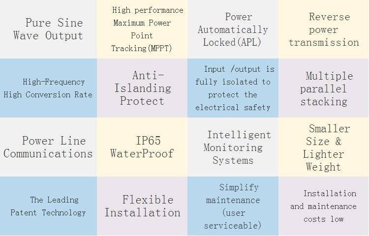SP 1200W Series Using IP65 waterproof streamline design, Can effectively high performance Maximum Power Point Tracking(MPPT)Function,Better able to track changes in the solar luminosity and control different output power, Effectively capture and collect sunlight. AC electric power transmission using the reverse transmission technology, Is one of our patented technology, the inverter output power can provide load priority use Extra electricity to the grid, efficient use of the inverter to the power emitted, Electricity transmission rate of up to 99%.